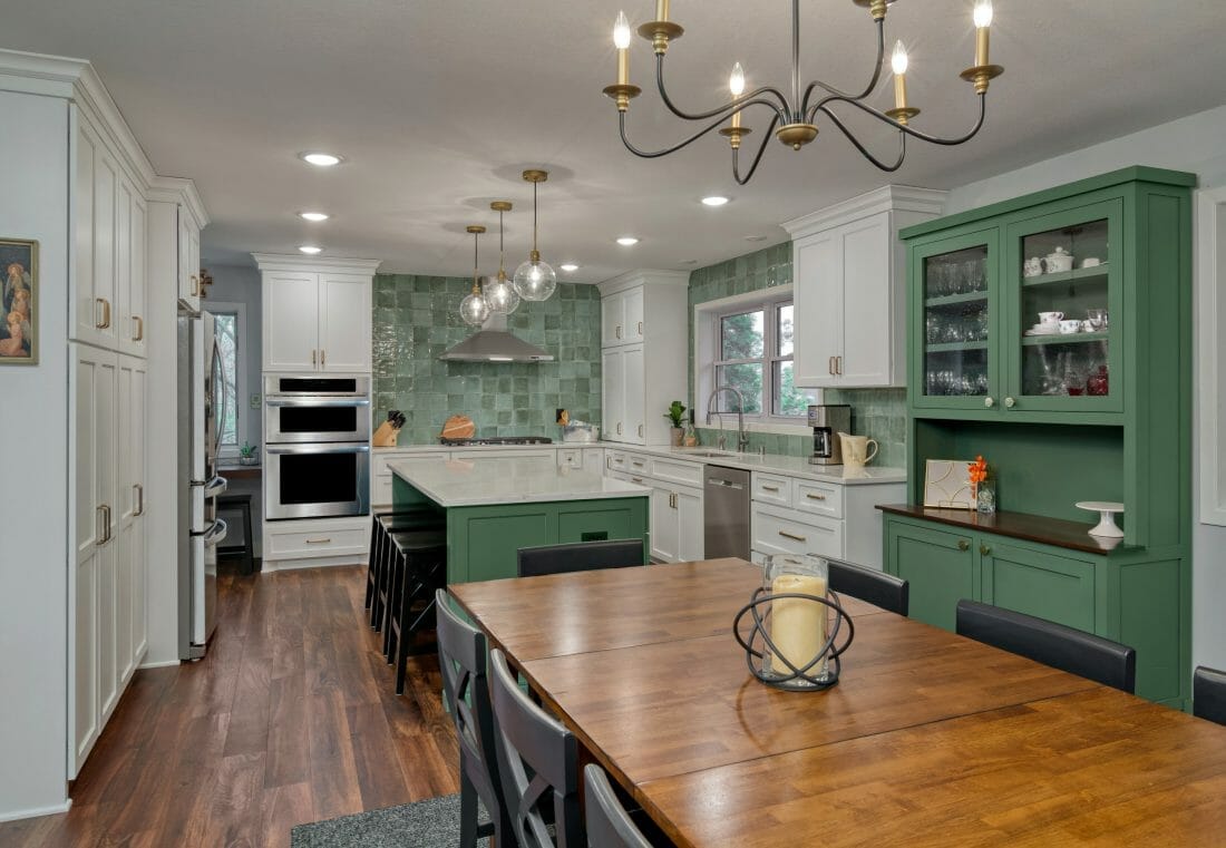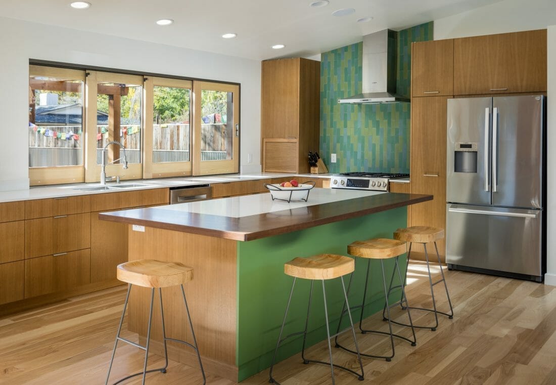 Here, lime green kitchen cabinets brighten and revive the interior in an instant. Moreover, backsplash tiles, dining chairs, and retro pendants repeat the hue for some additional cheer.