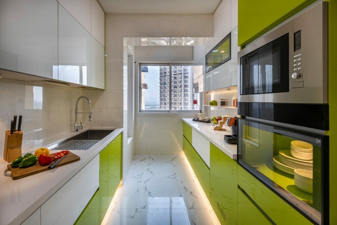 This galley kitchen is trendy and energetic. Custom streamlined cabinets wear olive green. They embody urban minimalism while bringing the space to life, too.