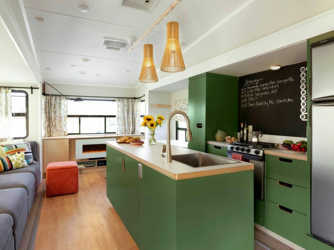 Here, homeowners mostly painted their cabinets lime green. The tray and conical pendants wear the same custom shade for visual cohesion.