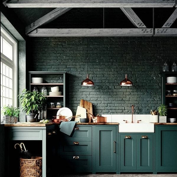 Here, rich emerald green base cabinets and bricks offer depth. Meanwhile, the copper hardware, pots, and pans deliver a glam contrast.