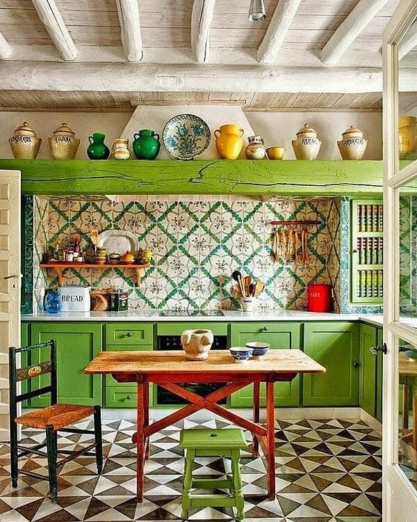 The kid’s stool, beam shelf, and lower cabinets wear lime green. Meanwhile, the chair, jugs, and decorative backsplash tiles impart other green shades.