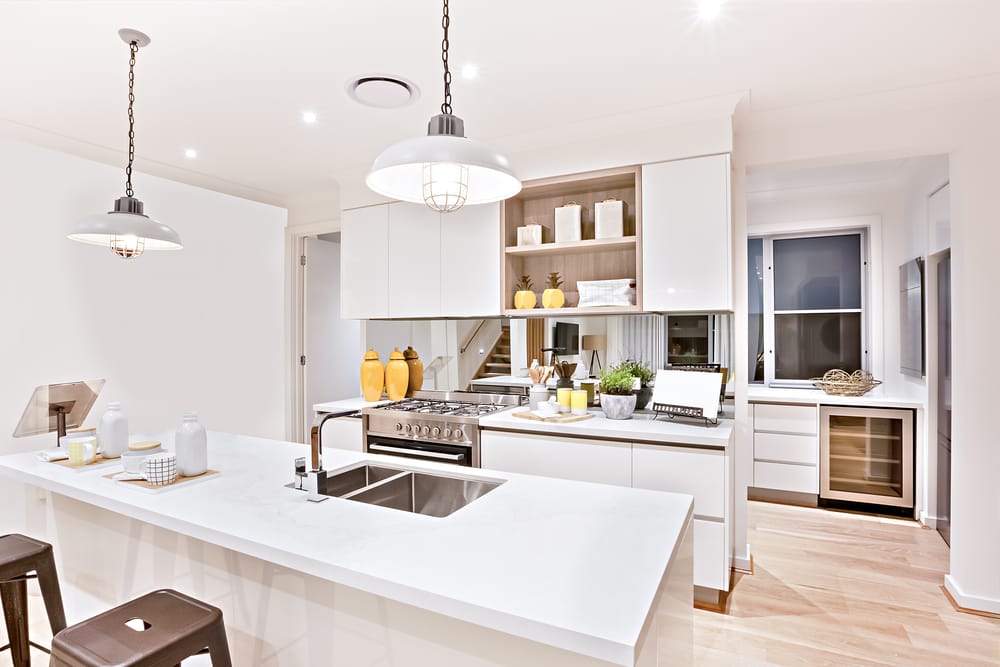 Cream ceiling, countertop, floor tiles, and walls quiet down the kitchen. Other than that, they let pure white units steal the spotlight. Golden flush ceiling light draws the eye upward due to its classy look.