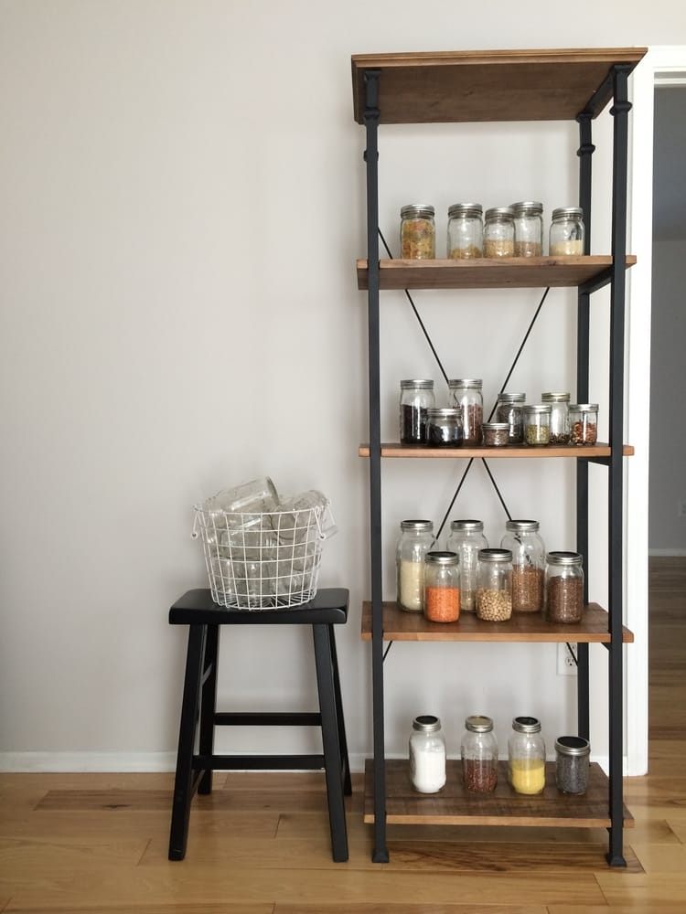 Well, this wood-and-iron shelving unit looks so charming. It serves as an awesome place to store different sized jars filled with spices and baking essentials.