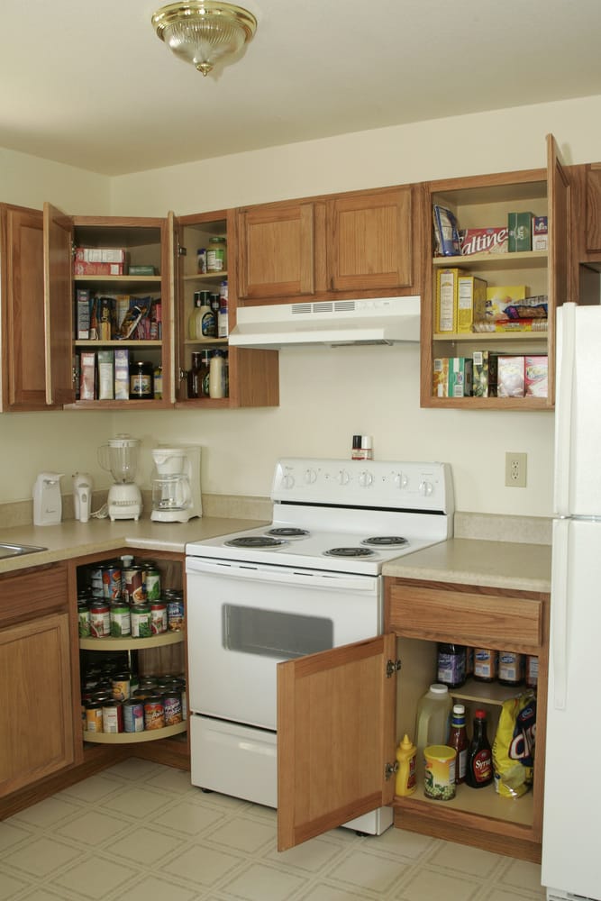 Wood cabinets and rounded corner shelves make the most out of space. They are a lovely spot for lots of pantry staples. What a well-stocked kitchen!