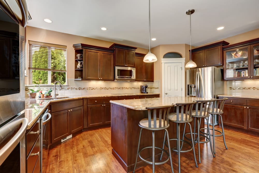 Dark wood pantry cabinets provide ample food storage and exude a sense of equanimity. Meanwhile, the glass-faced ones display tableware collection and cookbooks. This remodeled kitchen is such a home paradise.