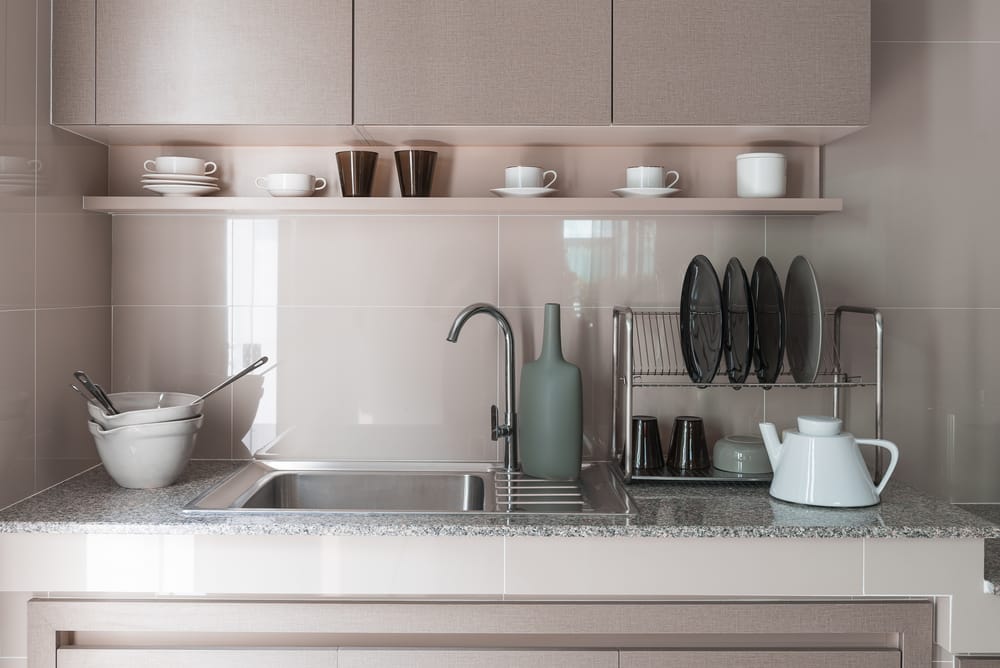 Gray and black pieces look fabulous against the gleaming taupe backsplash tiles. Custom-made cabinet pantry discretely keeps store-bought foods. Meanwhile, the tableware set is arranged on an open shelf underneath the cabinetry.