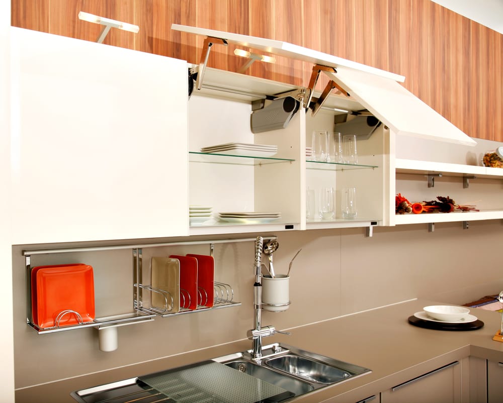 White upper cabinets and ceiling make the kitchen feel more spacious. Meanwhile, the warmth of wood lower cabinetry balances out the stainless steel range hood’s coldness.