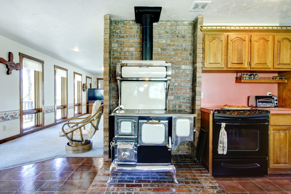 Here, the gleaming terracotta floor tiles come in rich brown shade. They offer intimate vibes to the farmhouse kitchen. Exposed brick accent wall adds color, rough texture, and rustic charm to the indoor space.