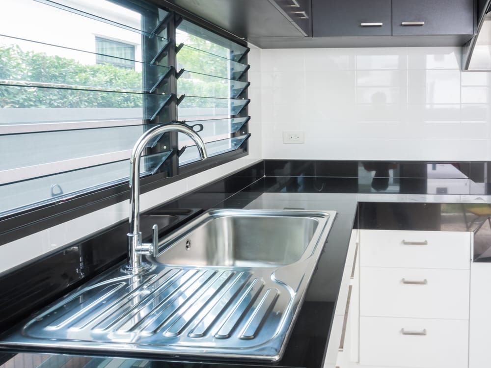 Sleek black cabinets and granite countertop create the perception of depth. Houseplants keep the area from becoming lifeless.