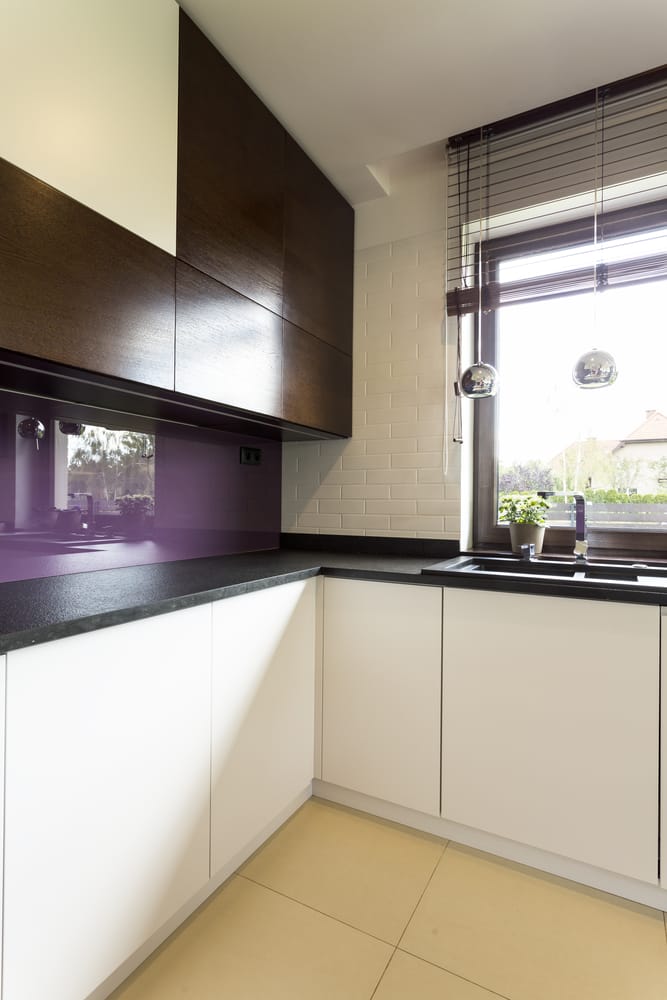 Cream matt porcelain floor tiles quiet down the room. The wall is clad in white subway tiles in running bond pattern. Purple backsplash brings the regal feel to the cooking area.