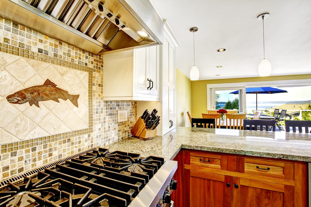 This culinary space employs an attractive backsplash made up of diagonal cut, fish and earth-toned mosaic tiles. They don’t clash with granite countertop at all.