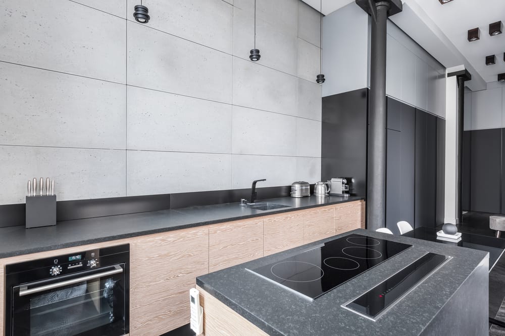 Well, this cooking area is so great to move in. Polished concrete tiles cover floor-to-ceiling backsplash. They lead to a stylish industrial interior space.