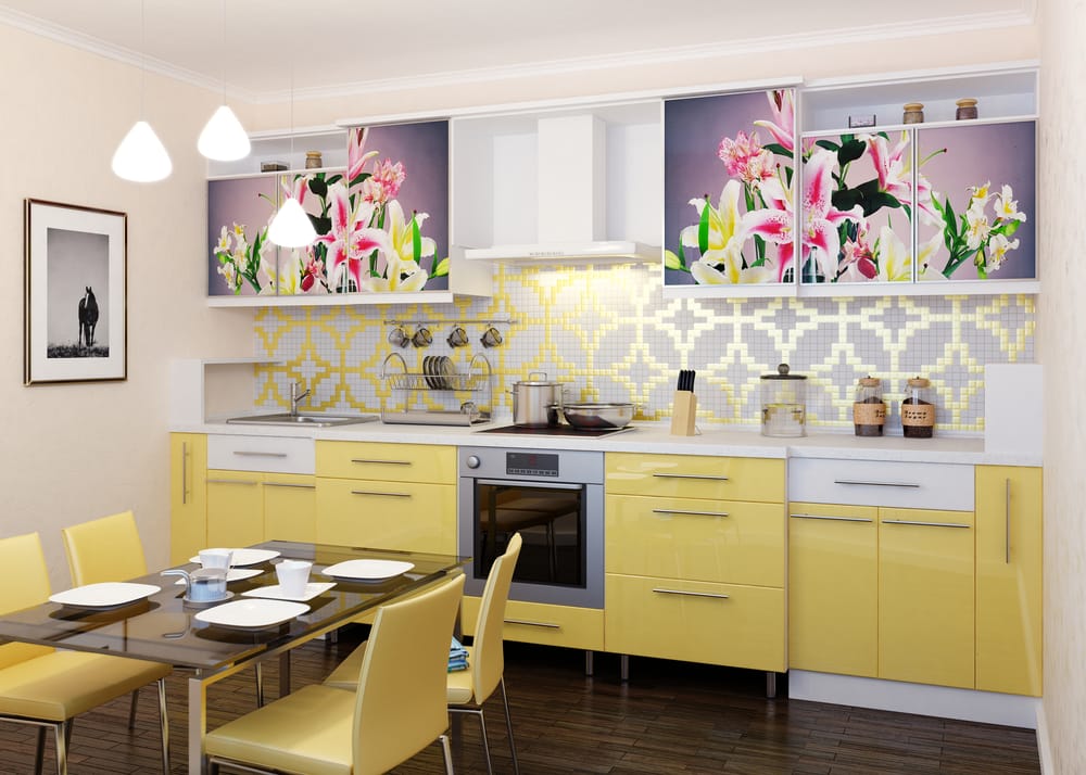 Neutral space scheme lets the bold units sing out. Stunning floral cabinets add a girly feel. Canary yellow lower cabinets and dining chairs exhibit a cheery atmosphere.