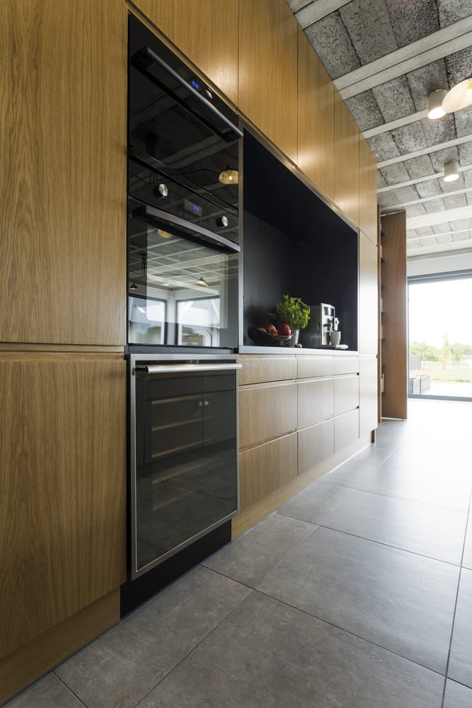 Underfoot are beige matt porcelain floor tiles. They coordinate perfectly with wooden cabinetry and dining table. Lastly, indoor plants enliven the zone.
