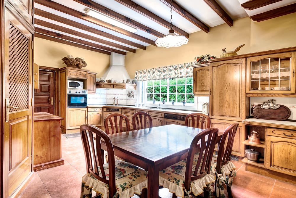 Exposed ceiling and wood cabinets reveal nature’s beauty. Travertine floor tiles, Windsor cherry wood chairs, and vintage pendant light are the epitome of French country design.