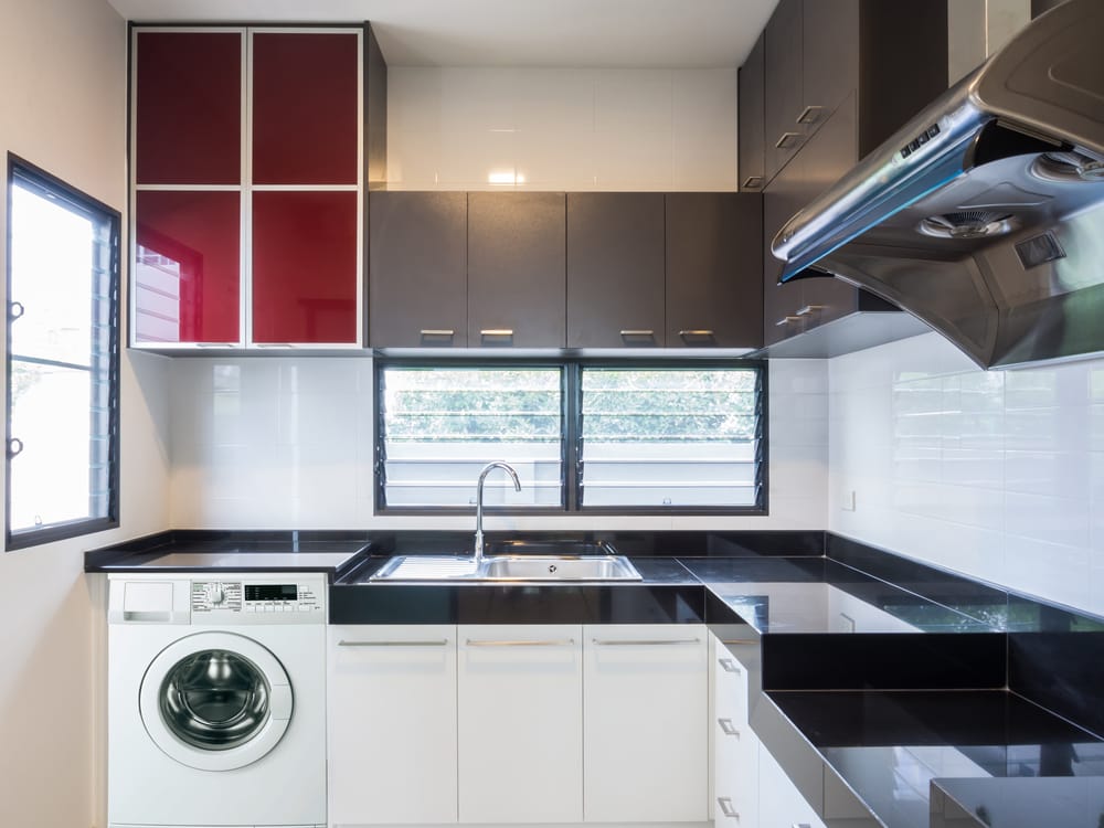 This culinary space employs Jalousie windows. They match amazingly with the modern interior of the kitchen. Additionally, they give the room unrestricted views and great ventilation.