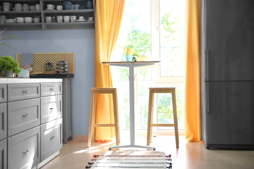 Light blue wall balances out the gray refrigerator. Orange curtains from Amazon evoke a feeling of freshness. They accentuate the room too.