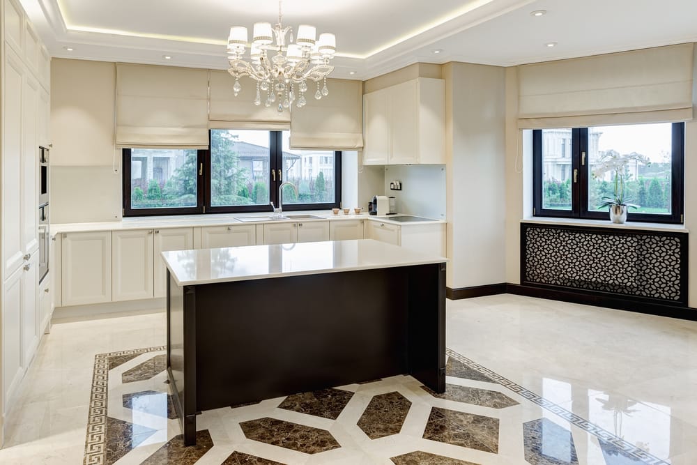 Black-framed Bermuda and double casement windows above sink are adorned with beige roller blinds. They withstand moisture very well. Lastly, a crystal chandelier radiates timeless luxury.