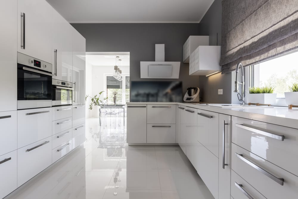 This monochrome kitchen is fashionable. Take a look at those metallic drawer pulls, sleek cabinetry, and high-end appliances.