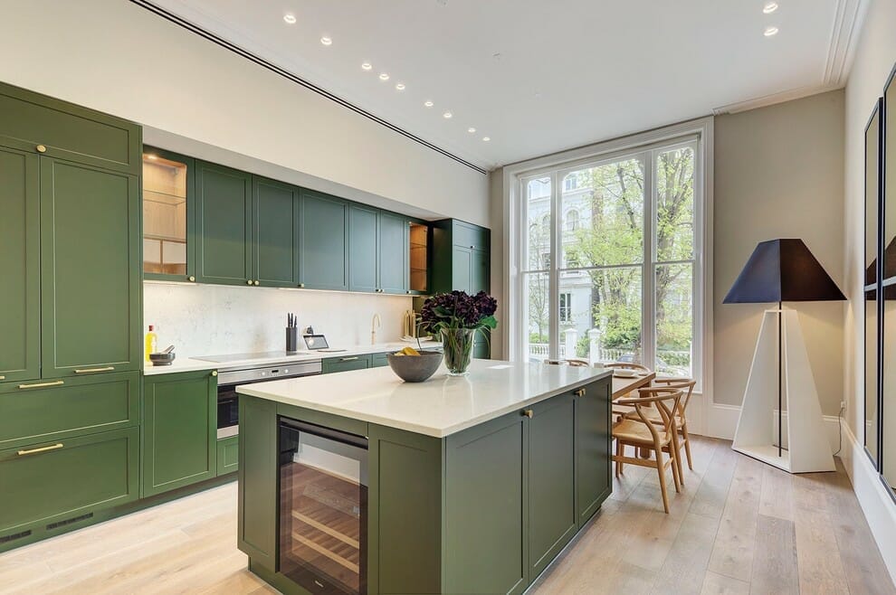A green army in a matte finish and a bit of touch of gold on the cabinetries will turn your cooking space into an elegant and calming spot.