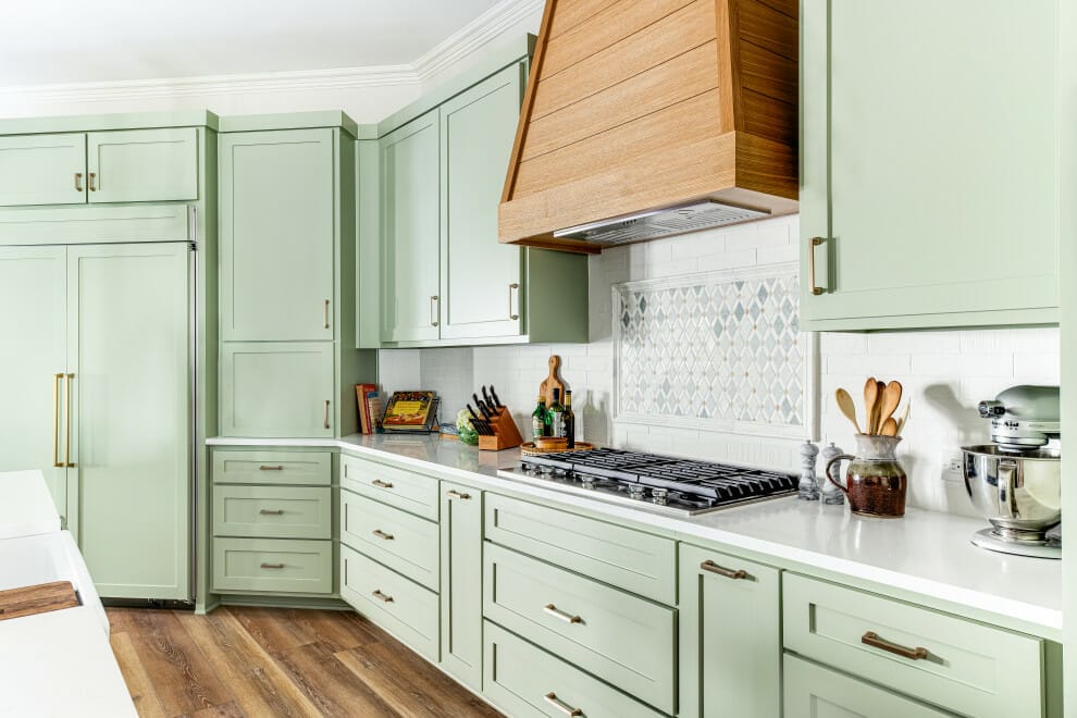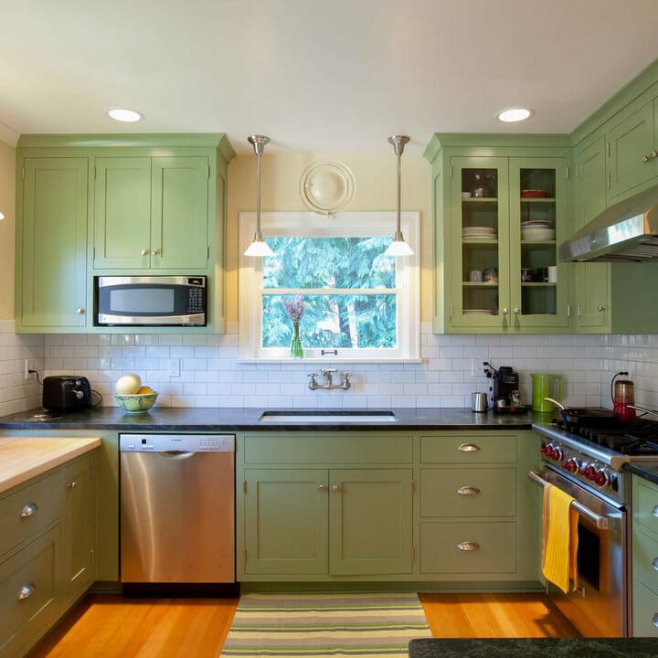 Green symbolizes the serenity of nature. Thus, you can bring it to your kitchen to refresh a previously dull look. Moreover, you can add a touch of gold to the cabinet pulls and faucets to state your cooking area.