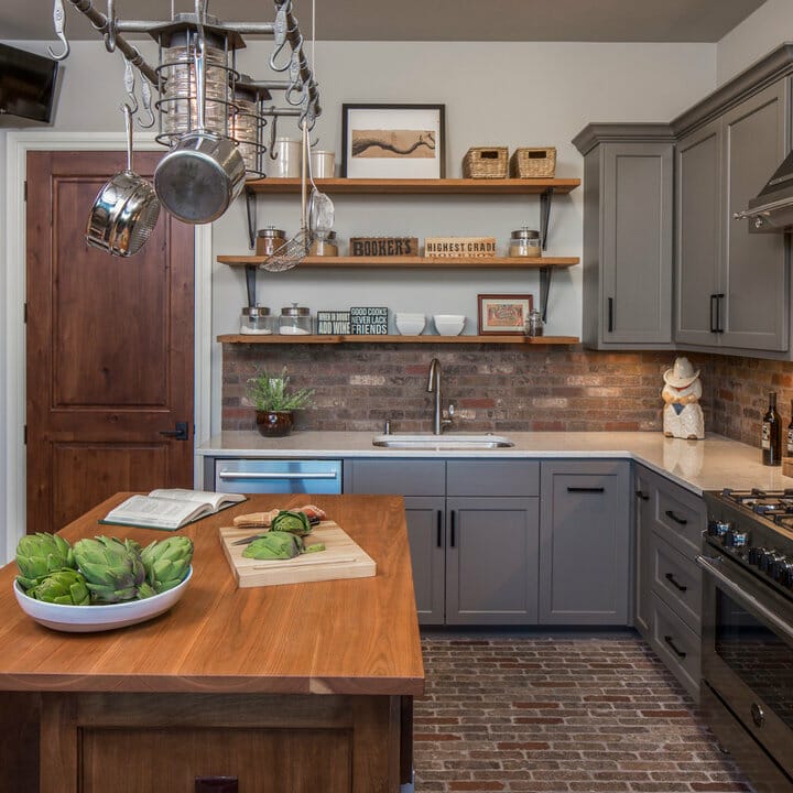 You can balance the rigid industrial theme in your cook room by presenting painted kitchen cabinet ideas with a soft gray color.