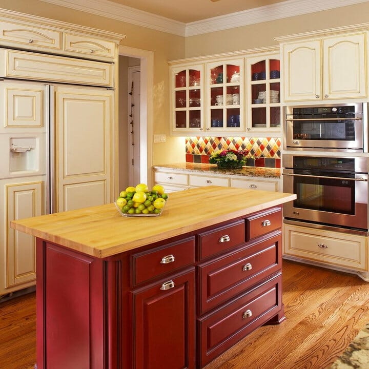 Try to paint your wall cabinet with cream to make it more attractive, then leave the kitchen island in red to become the focal point. And, don’t forget the backsplash, which comes with multi-colored small rhombus tiles.