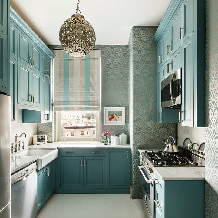 As in the design above, duck egg blue cabinetries will go well with patterned wallpaper in the same tone.
