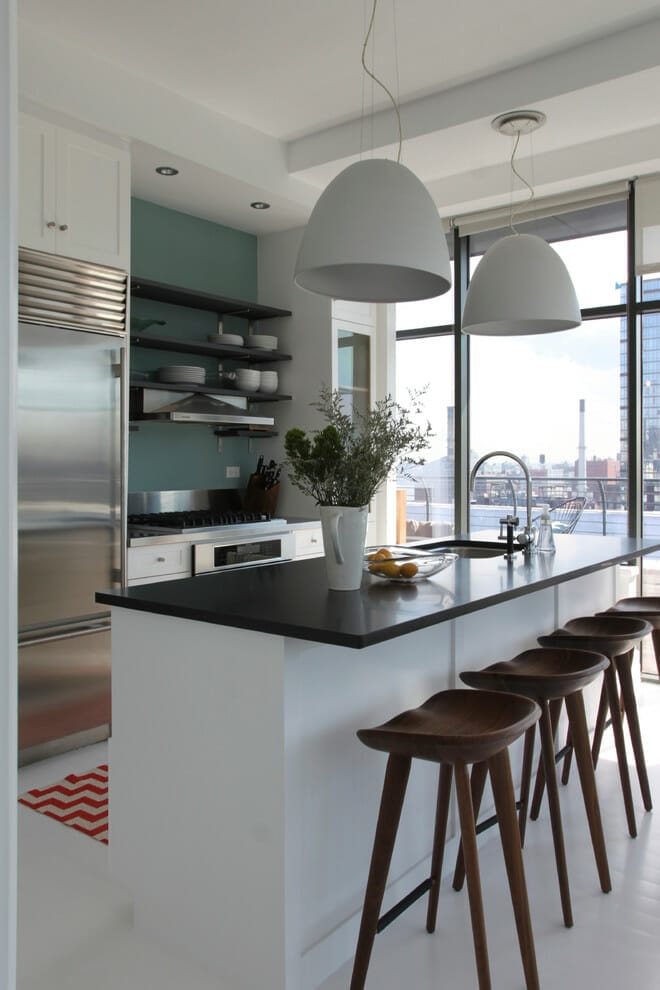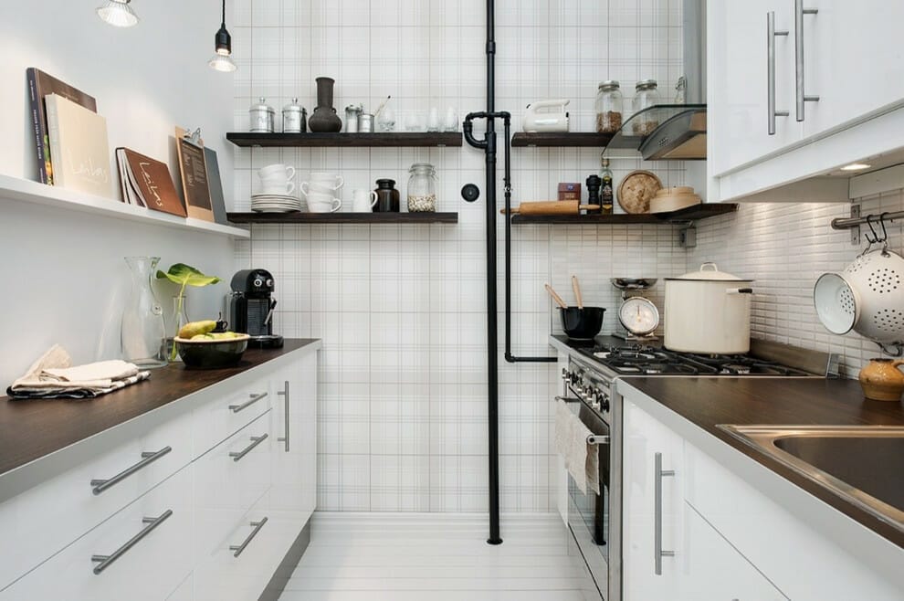The touch of industrial in this galley kitchen is visible on the black exposed pipes and the pendant lamp design.