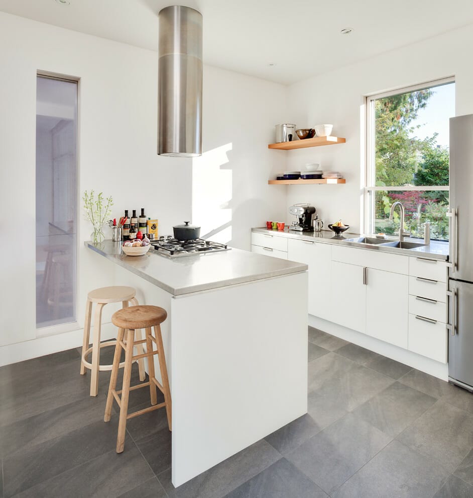 It features a skylight, a pair of floating cabinets with a range hood in between, horizontal tiles backsplash for wider space impression, sleek kitchen appliances, and all-white furniture.