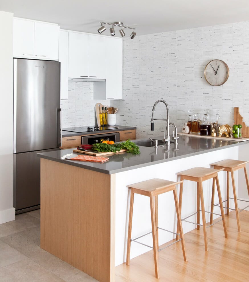 Moreover, the stained mosaic-like tiles, installed from the floor to the ceiling, complete the setting of white kitchen cabinets, metallic refrigerator, wooden breakfast bar with bar stools, and gray countertop.
