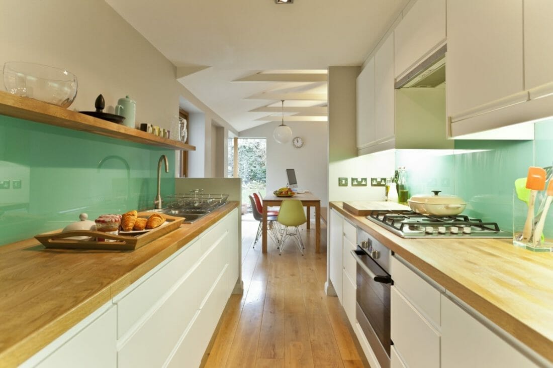 Smooth and matt surfaces always need a few textures or patterns in the mix. This is one of the small galley kitchen ideas on a budget that applies the principle to get rid of the monotonous setting.
