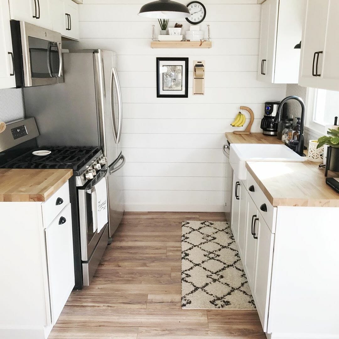 Your next small galley kitchen ideas on a budget are from this kitchenette. It completes the set with a shiplap wall, small herringbone tiles backsplash, butcher block countertops, and light tone wood flooring.