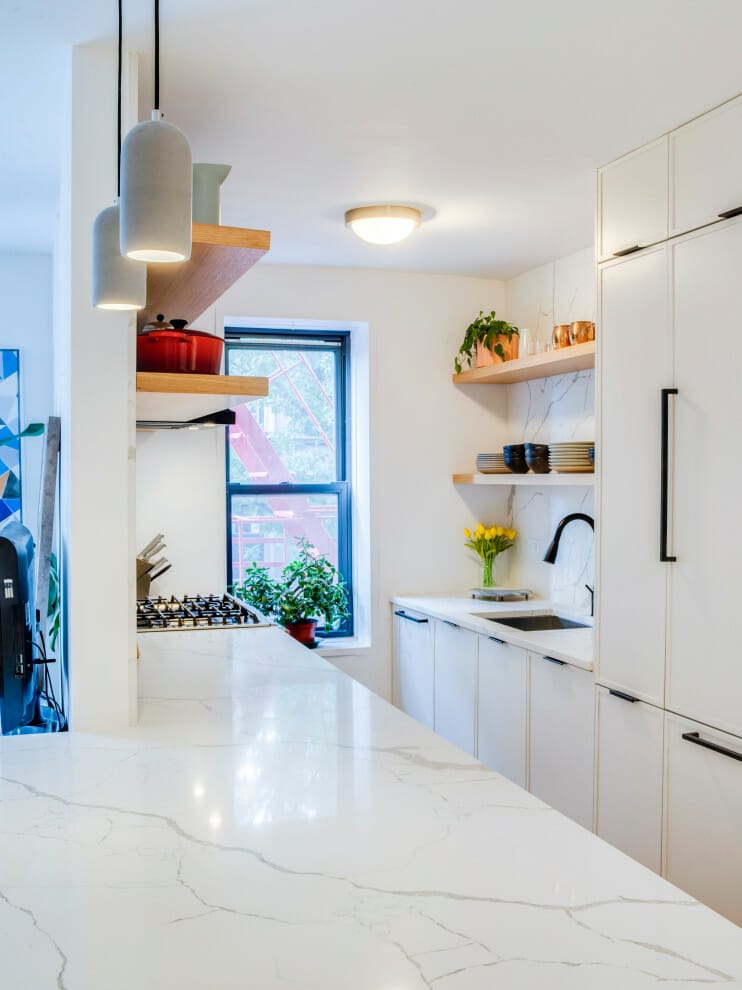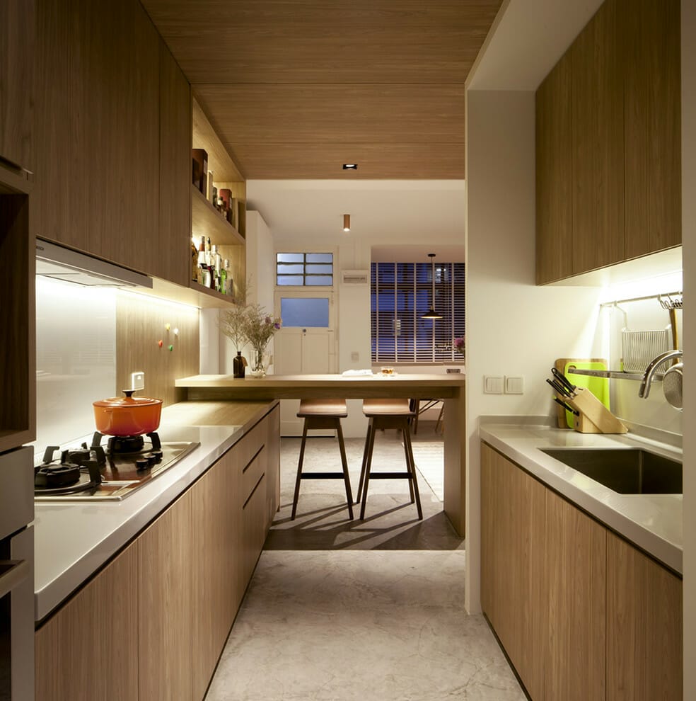This galley kitchen plays with crisp white as its main show and picks medium tone wood as the secondary. It results in gorgeousness all over. Additionally, the moldings on one of the walls are there for texture.