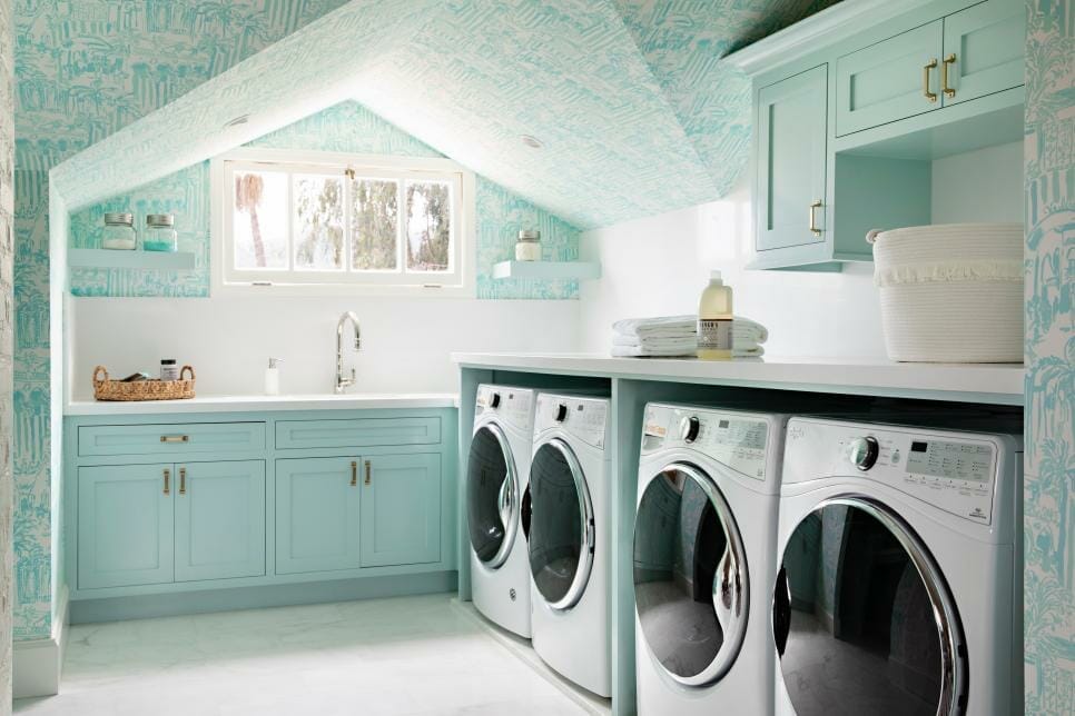 Besides, the wallpaper makes the laundry room feel cohesive. Moreover, the gold hardware gives the space a touch of luxury.