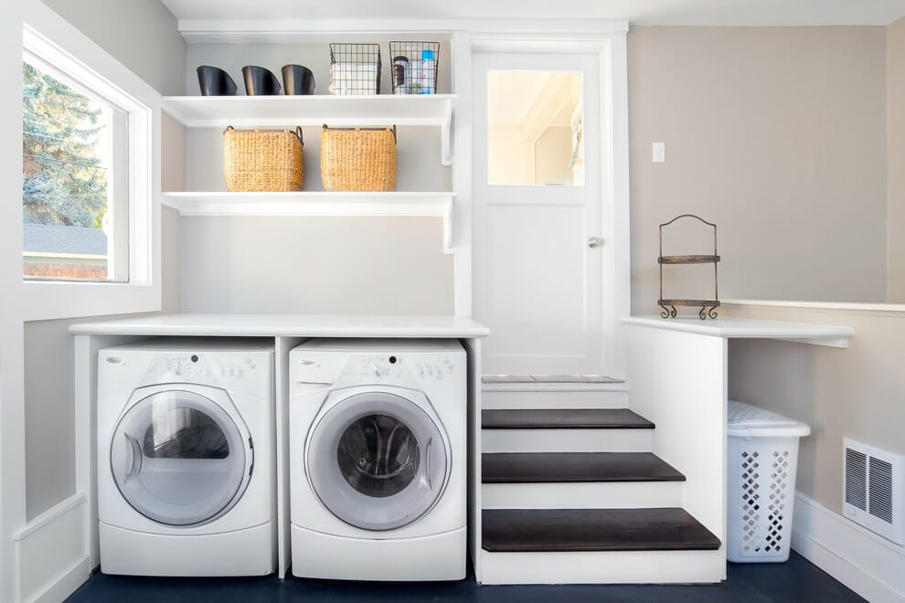 Need laundry room countertop ideas for tiny spaces? You can copy this laundry room. Despite being small, the white counter above the dryer and washer comes in handy.