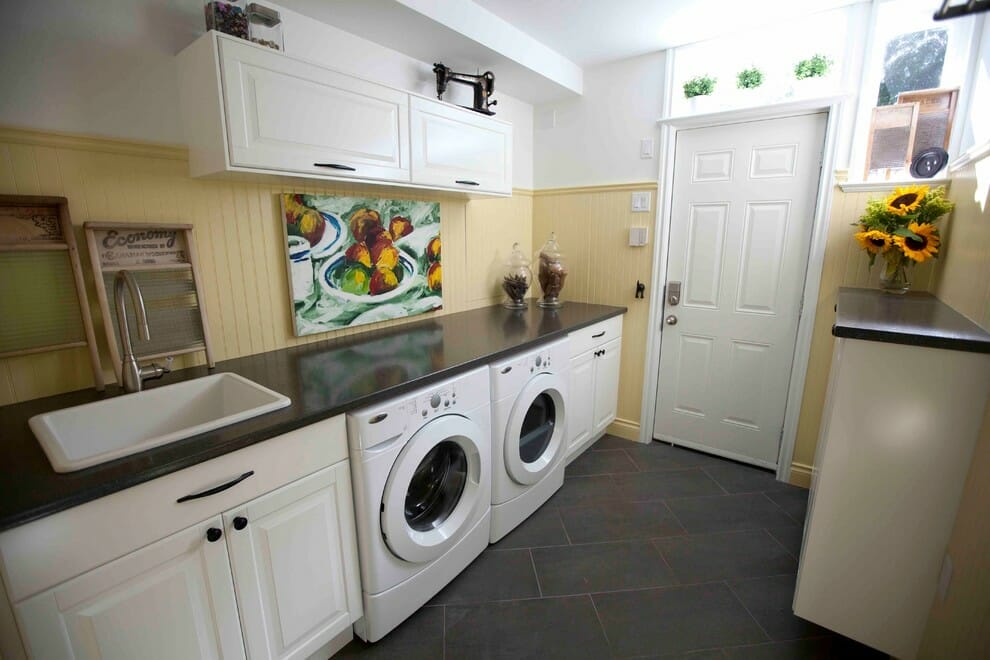 In this retro laundry room, the pure white sink contrasts with the granite counter. Meanwhile, the painting, buttercup-painted beadboard paneling, and sunflowers provide some cheer.