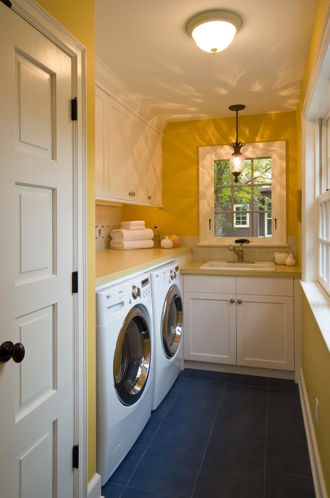 As you see, this retro laundry room is narrow. However, the homeowner doesn’t think of it as a restraint. There are upper and lower counters that make the process of doing laundry much smoother.