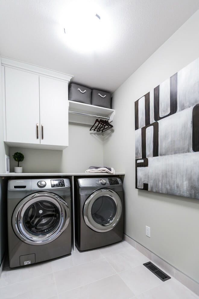 This modern laundry room is not large, yet it feels open. The stark white counter, front-loading appliances, and cabinets keep things airy.