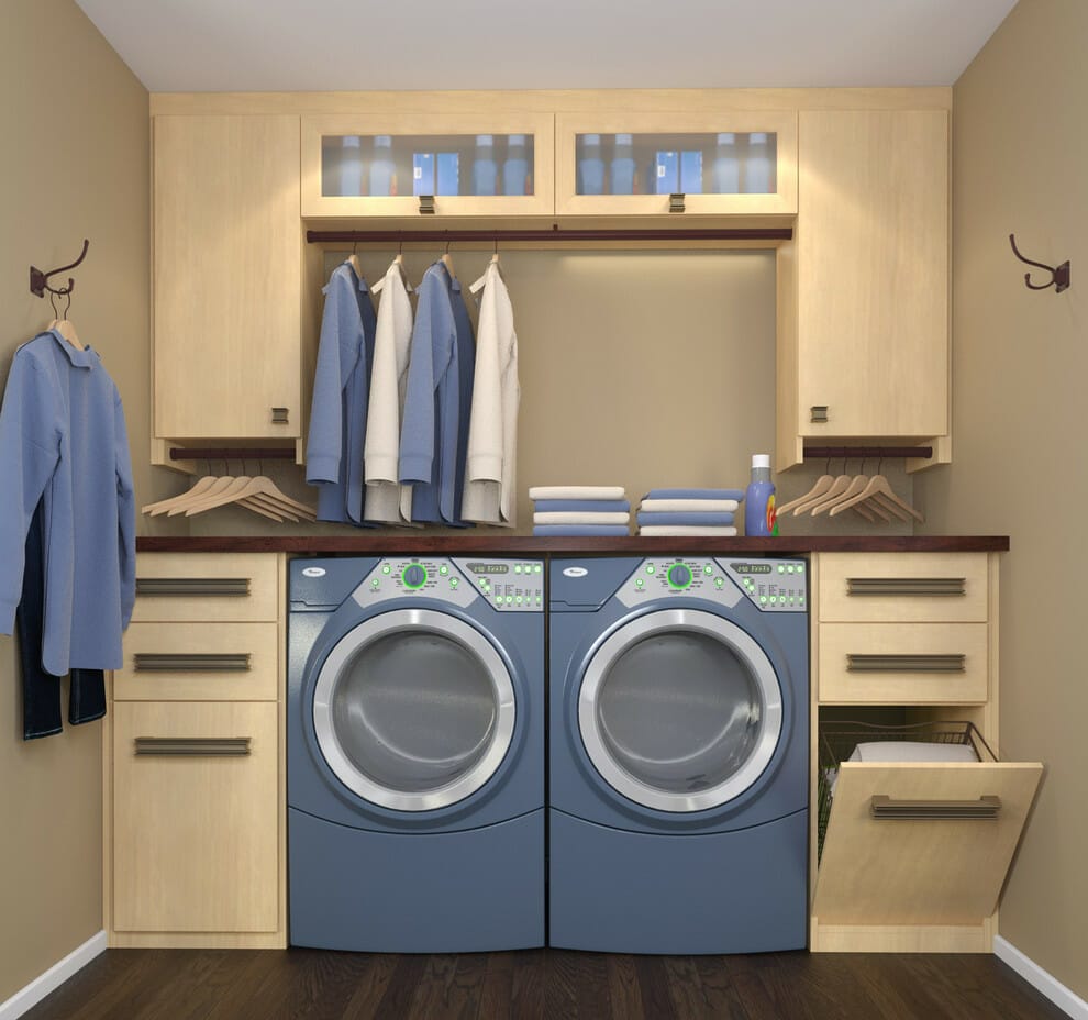 Besides, the dark wood counter adds more warmth to the small laundry room. It lets you fold all your clothing while mingling with taupe walls and blonde wood cabinets.