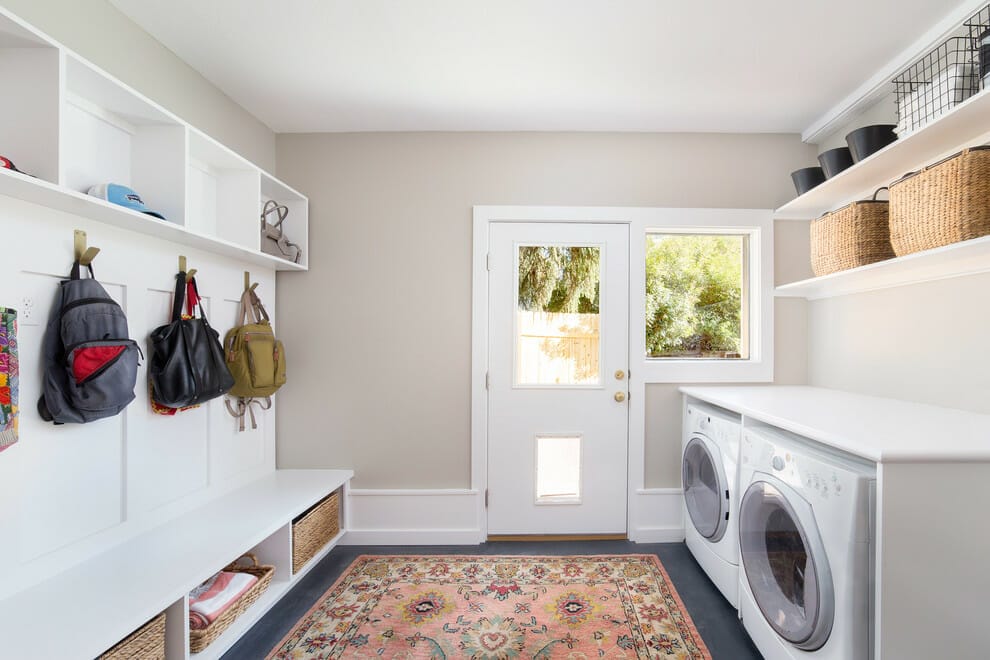 Limited space? You should apply brilliant laundry room countertop ideas. Here, the laundry room also serves as a mudroom.