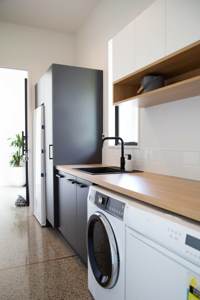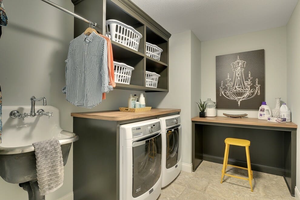 Butcher block counters bring a breath of fresh air to this predominantly gray laundry room. Apart from holding cleaning supplies, they enable you to fold clothes neatly.