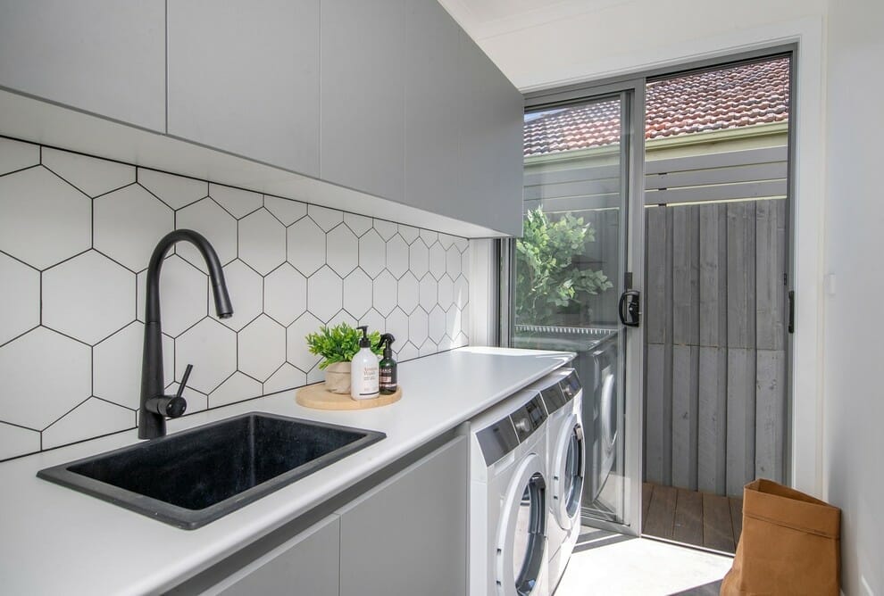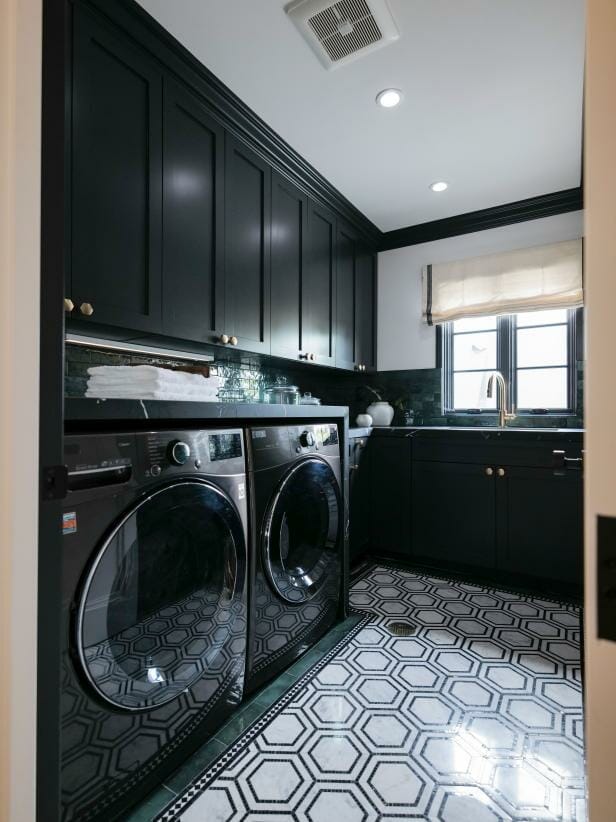 The dramatic black marble countertop lets you stack towels and park detergent jars. Big thanks to hexagonal flooring, the laundry room looks attractive.