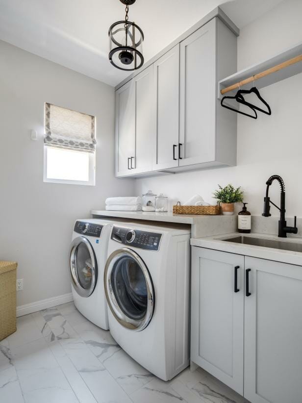 Sleek marble countertops accommodate a deep sink and two laundry room appliances. All things black lend the pale gray-and-white room drama.