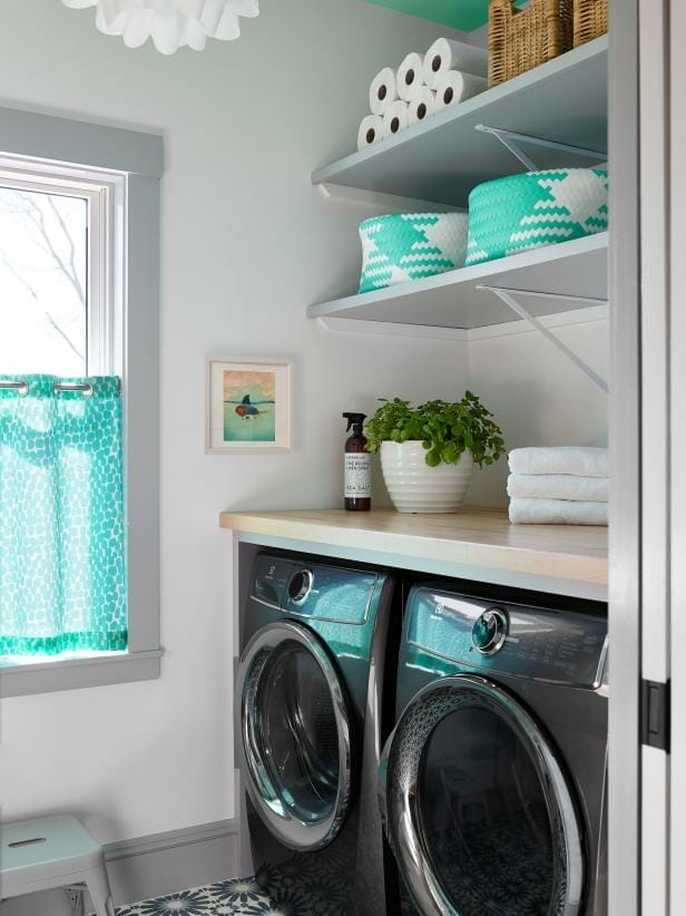 This tiny laundry room is airy because of the blue walls. Meanwhile, the laminate counter warms up the space while becoming a handy place to fold laundry.