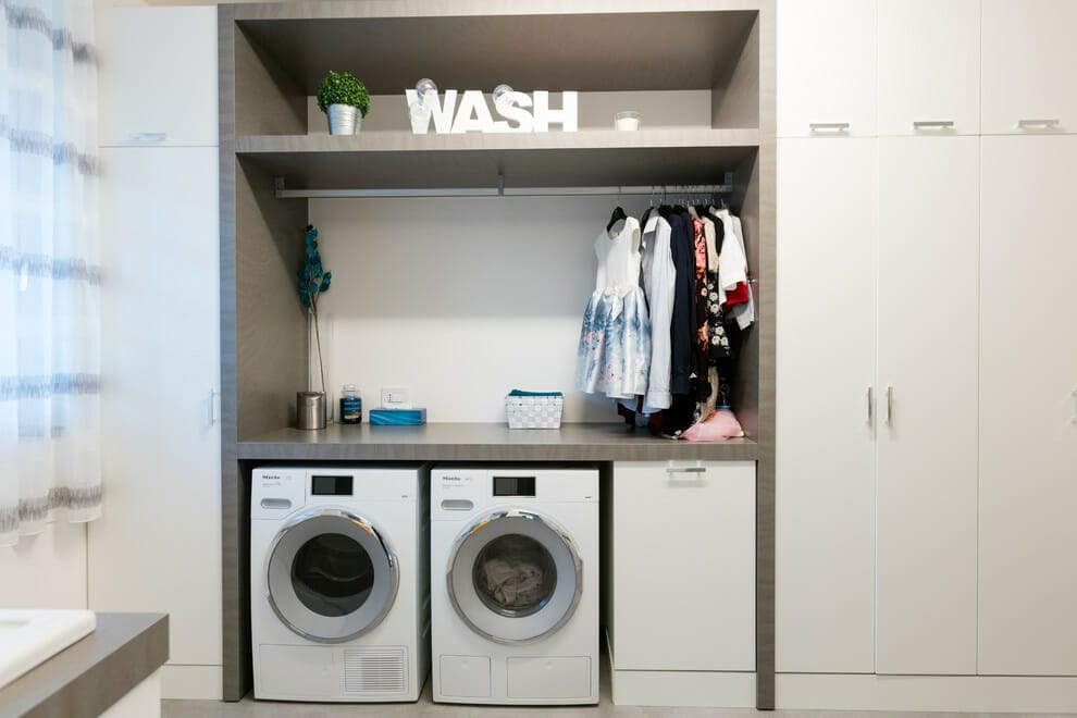 The custom counter comes with a divider that separates a washer from a dryer. Meanwhile, the baskets and clothes rack produce more storage space.