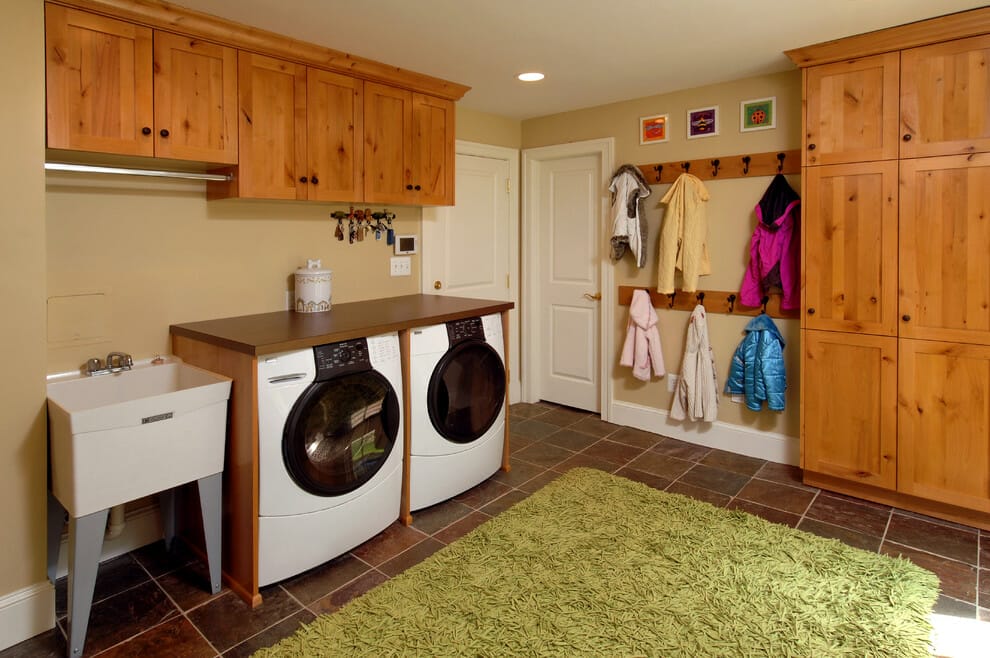 The hardwood counter creates a statement look and refined atmosphere instantly. Moreover, the lime green rug, standalone sink, and natural stone tiles make the laundry room complete.