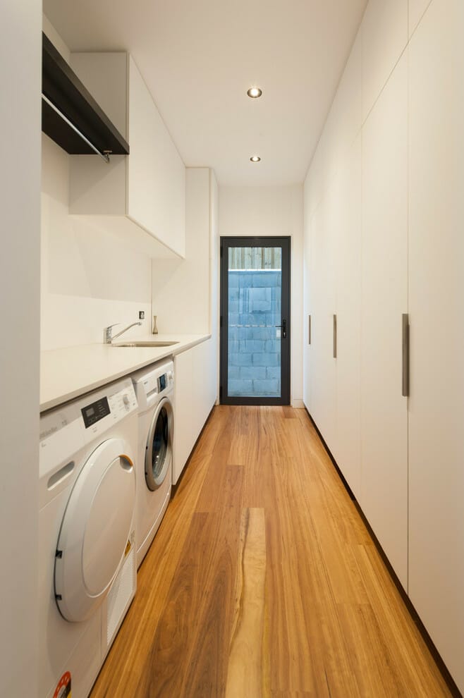 Here is another galley laundry room. The white counter, front-loading appliances, walls, and custom cabinets enlarge it instantly.