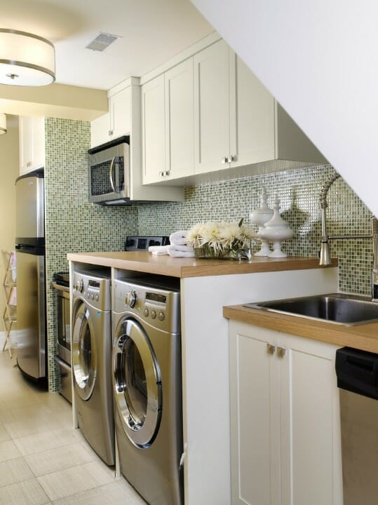 There are a couple of butcher block counters boasting a sink, a washer, and a dryer. Due to their soft color, dainty mosaic tiles become the center of attention.
