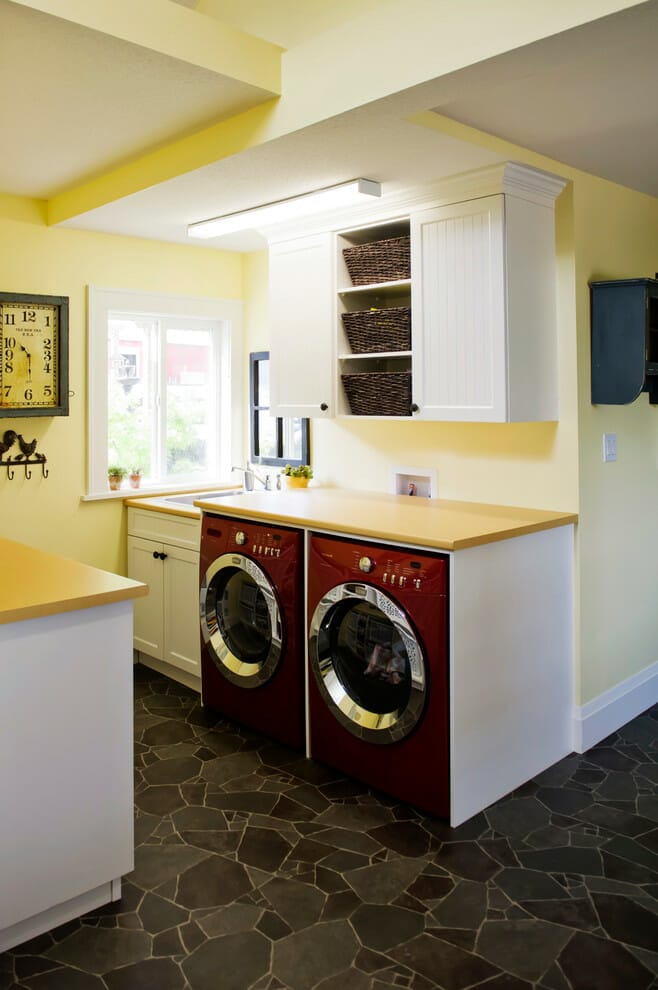 In addition to featuring a sink, the counter draws attention to deep red appliances. Meanwhile, the flagstone flooring and vintage farmhouse décor items complete the laundry room.